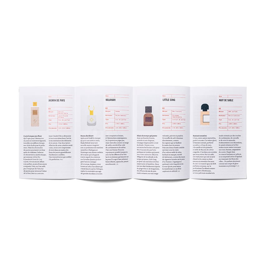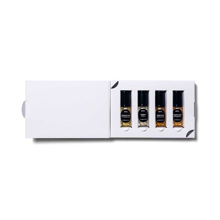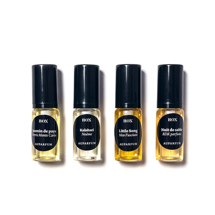 Une Box proposant Jasmin de pays de Perris Monte Carlo, Kalahari de Noème, Little Song de Meo Fusciuni et Nuit de sable de BDK parfums.
